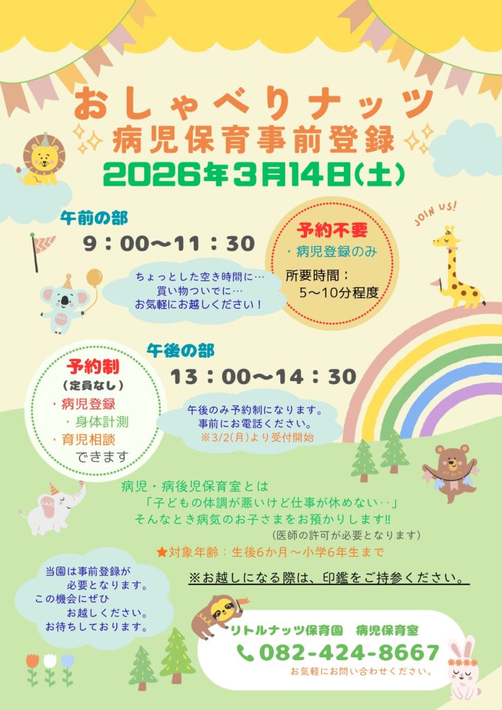 2026年3月14日(土)に病児保育事前登録会を行います!
